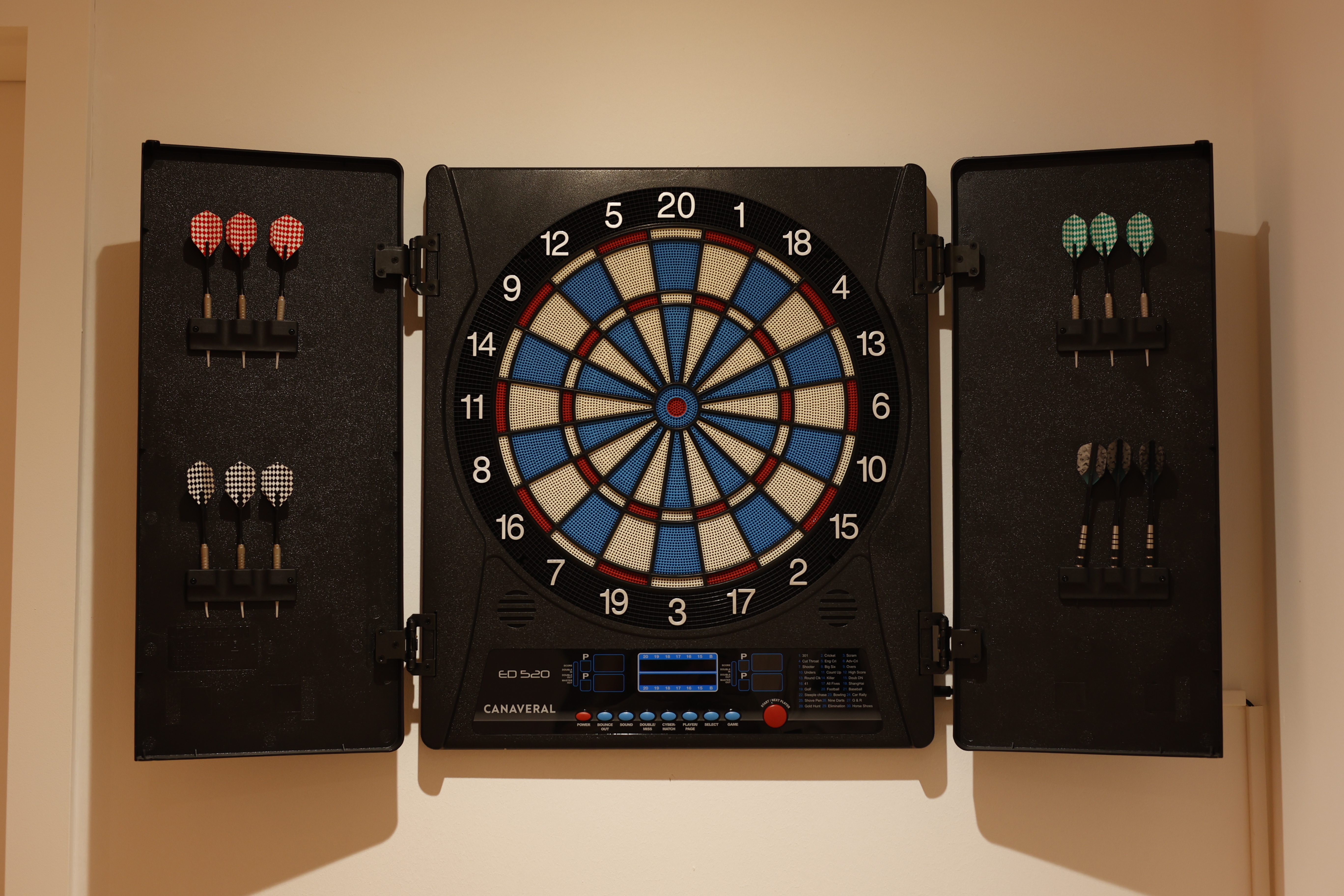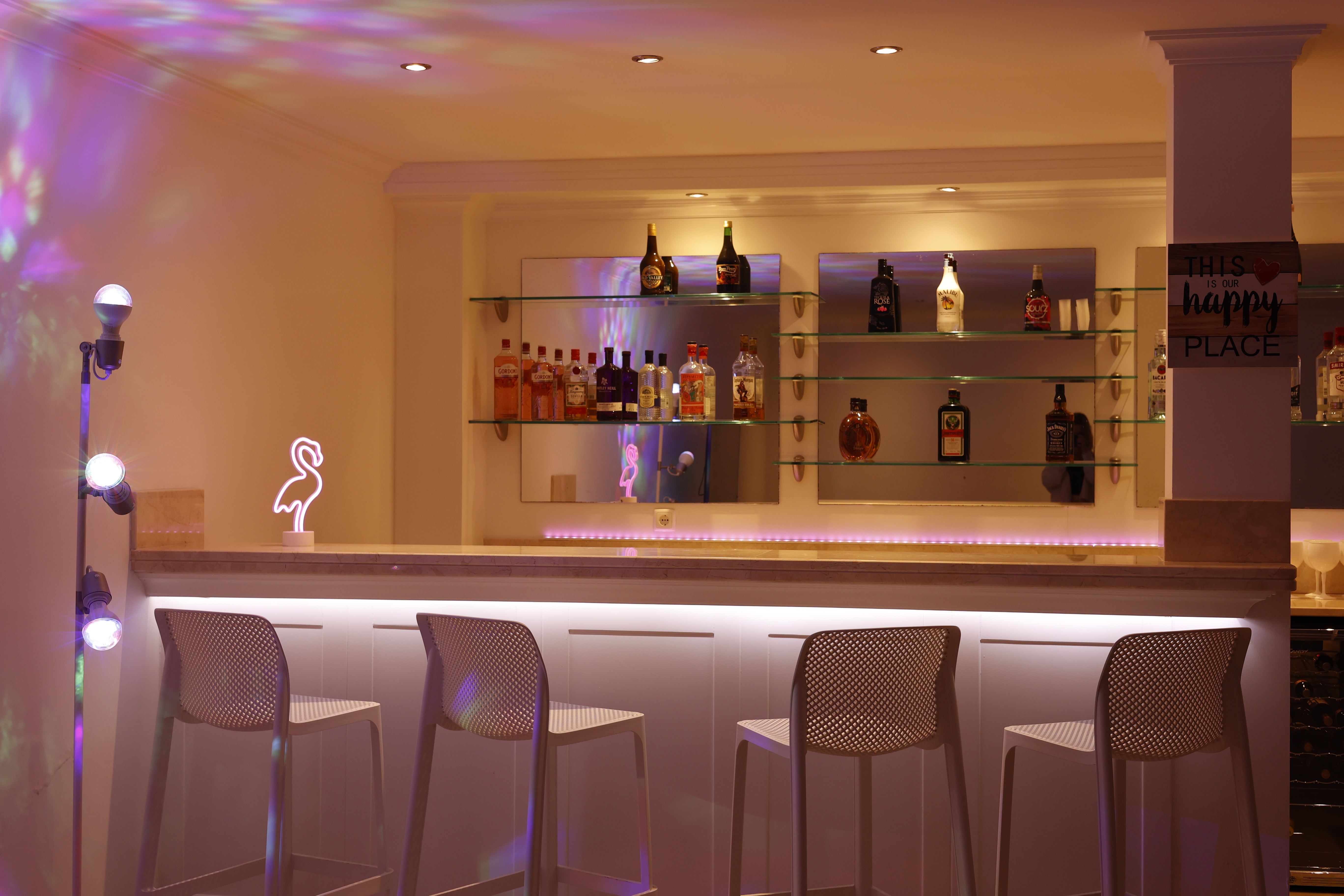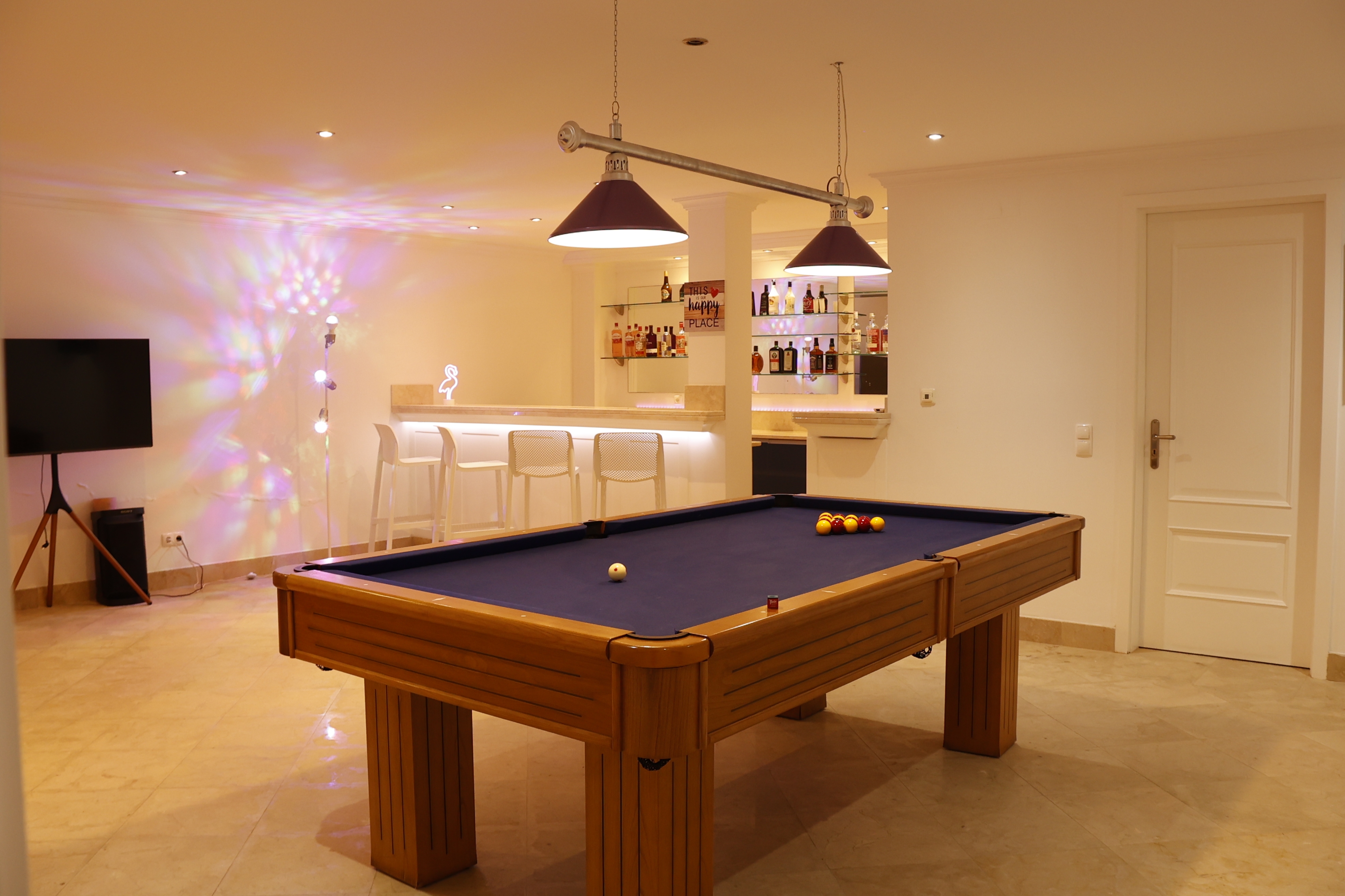 On the lower level of the property, you can find the utility room which houses the washing machine, dryer, iron and ironing board. You will also find the air conditioned entertainment room here with its own bar, a wine cooler, comfy sofa seating, dart board and a pool table.