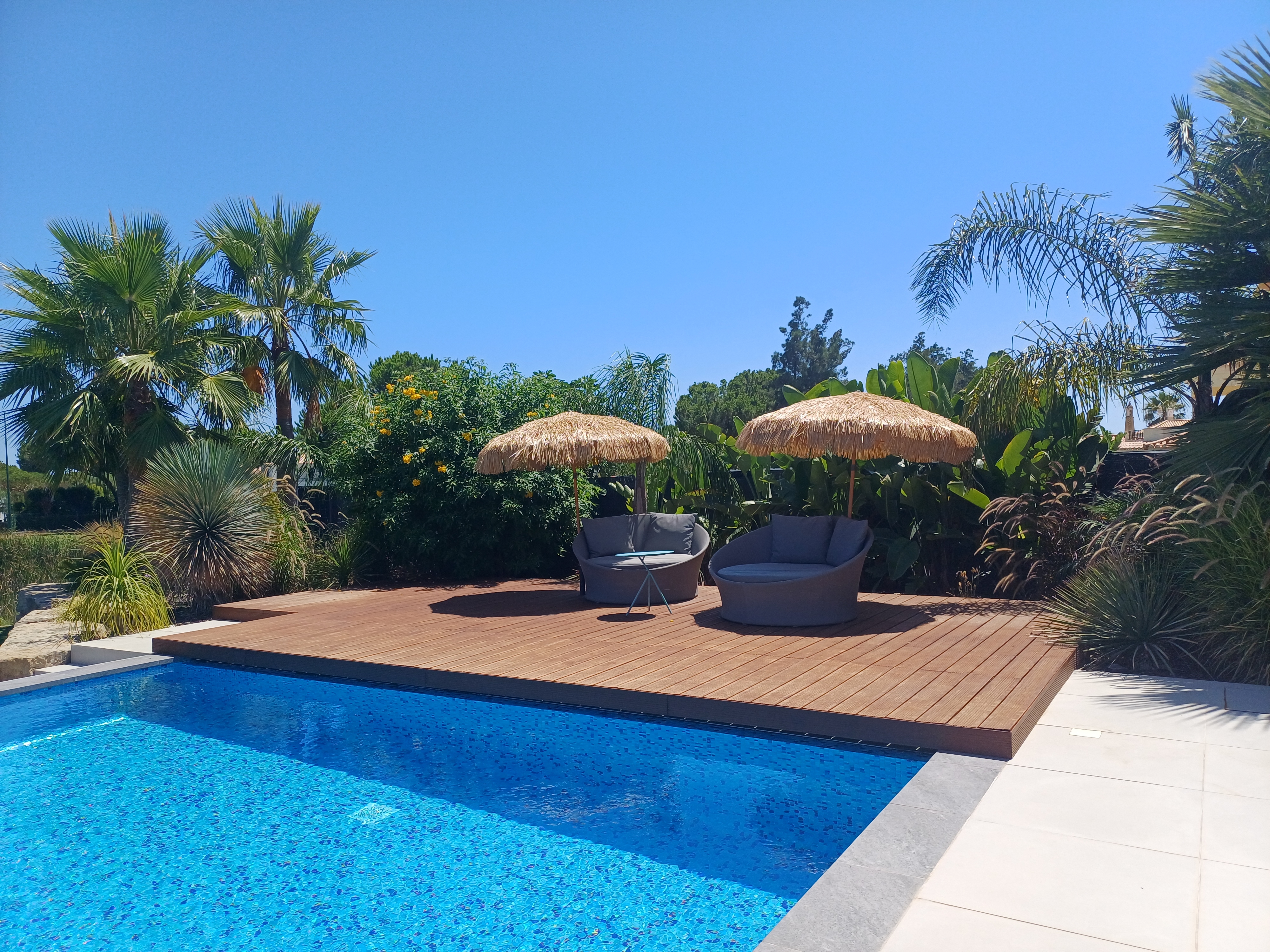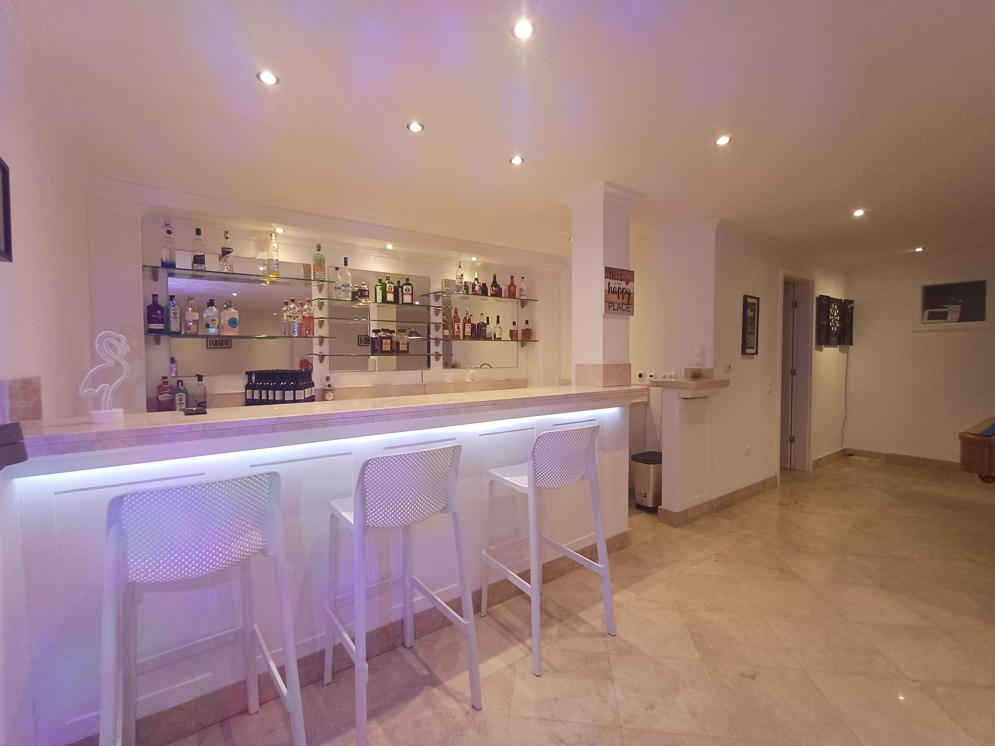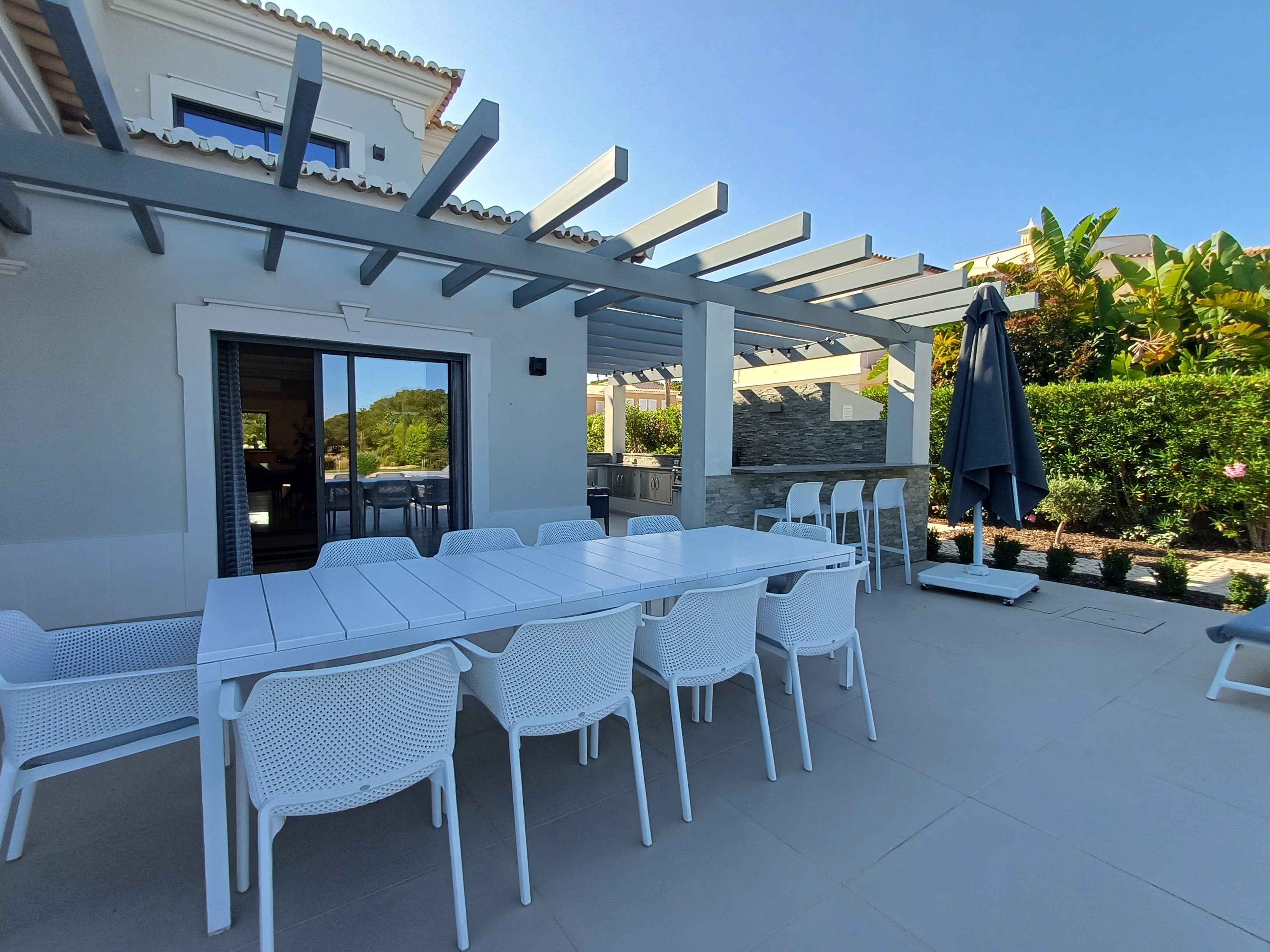 As you enter the gates of the villa, you will immediately feel right at home in the manicured forecourt with ample parking space. The rear of the property is where you will spend most of your time on holiday, relaxing on the terrace which gets the sun all day long and is furnished with twelve good quality sunbeds and parasols if you prefer a little shade. For the golfers in the group, the owners have built a putting green (Putters and balls provided). For the budding chef to cook up a feast in the outdoor kitchen there is a large gas BBQ, food preparation counters, a sink and an exterior fridge. There is a lounge area with comfortable sofas and the whole garden enjoys gorgeous views of the nearby golf course and lake. The infinity design pool has steps entry and measures approx. 12m x 6m with electric pool cover (the pool can be heated for a weekly supplement).