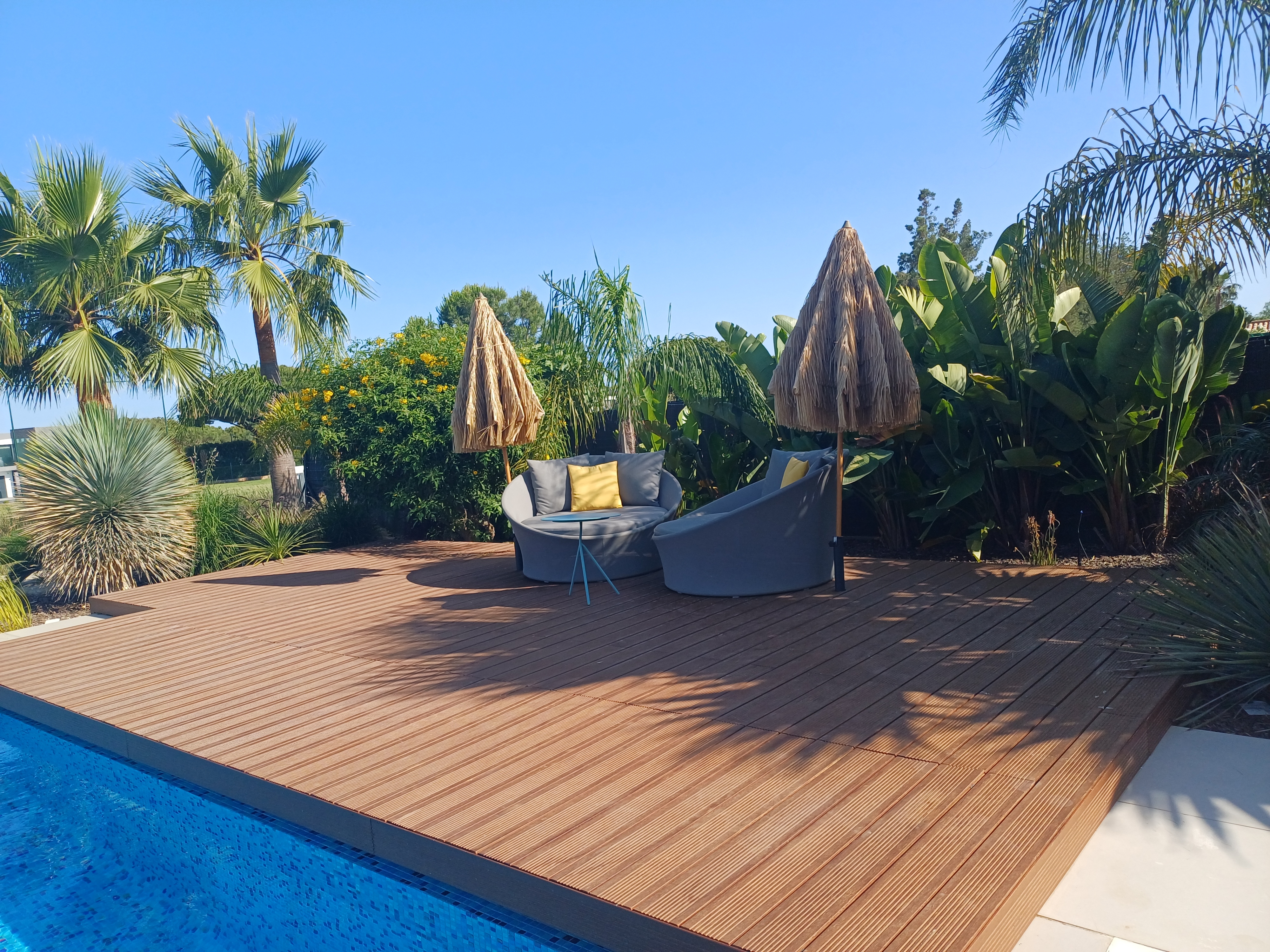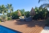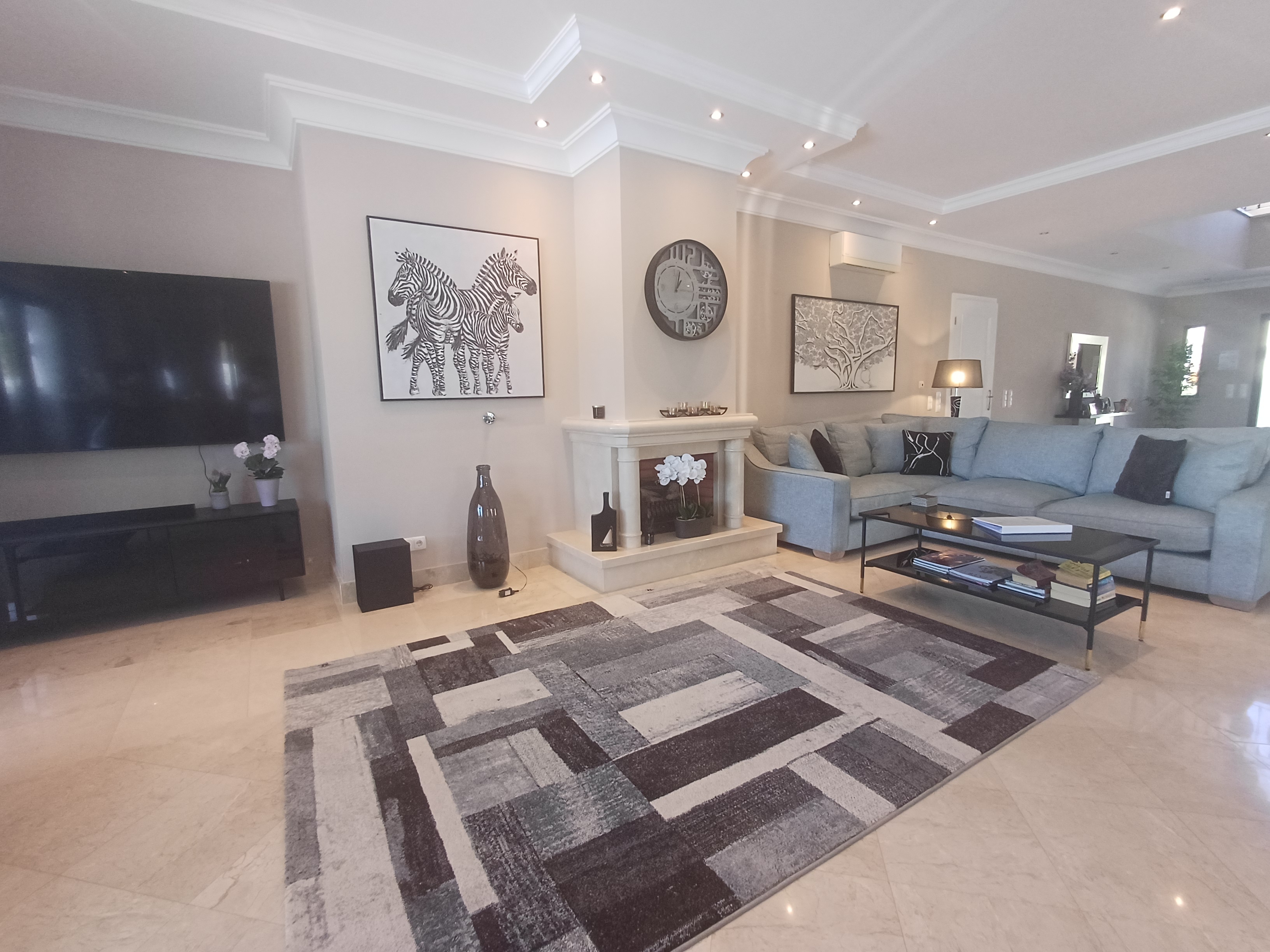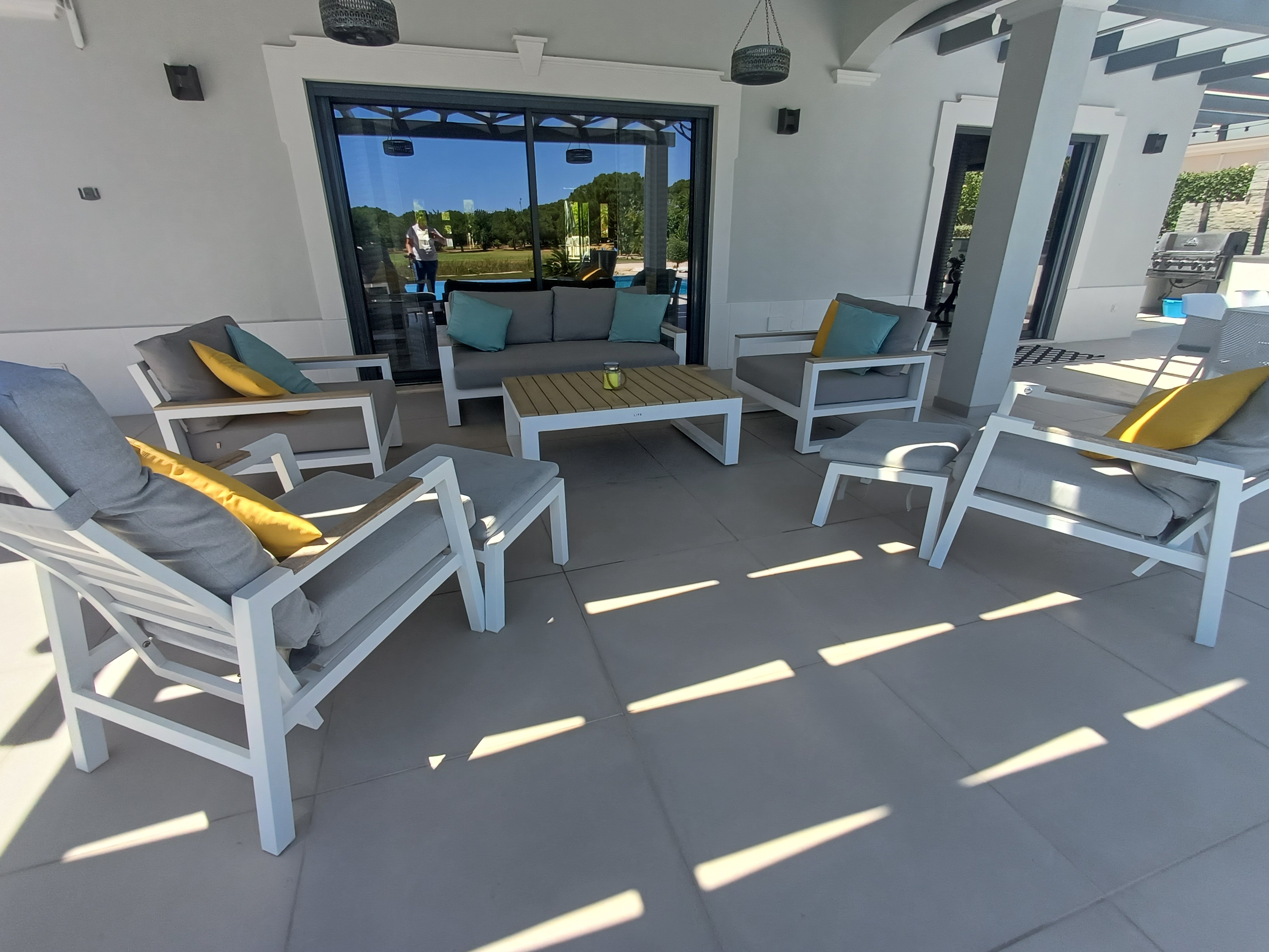 As you enter the gates of the villa, you will immediately feel right at home in the manicured forecourt with ample parking space. The rear of the property is where you will spend most of your time on holiday, relaxing on the terrace which gets the sun all day long and is furnished with twelve good quality sunbeds and parasols if you prefer a little shade. For the golfers in the group, the owners have built a putting green (Putters and balls provided). For the budding chef to cook up a feast in the outdoor kitchen there is a large gas BBQ, food preparation counters, a sink and an exterior fridge. There is a lounge area with comfortable sofas and the whole garden enjoys gorgeous views of the nearby golf course and lake. The infinity design pool has steps entry and measures approx. 12m x 6m with electric pool cover (the pool can be heated for a weekly supplement).