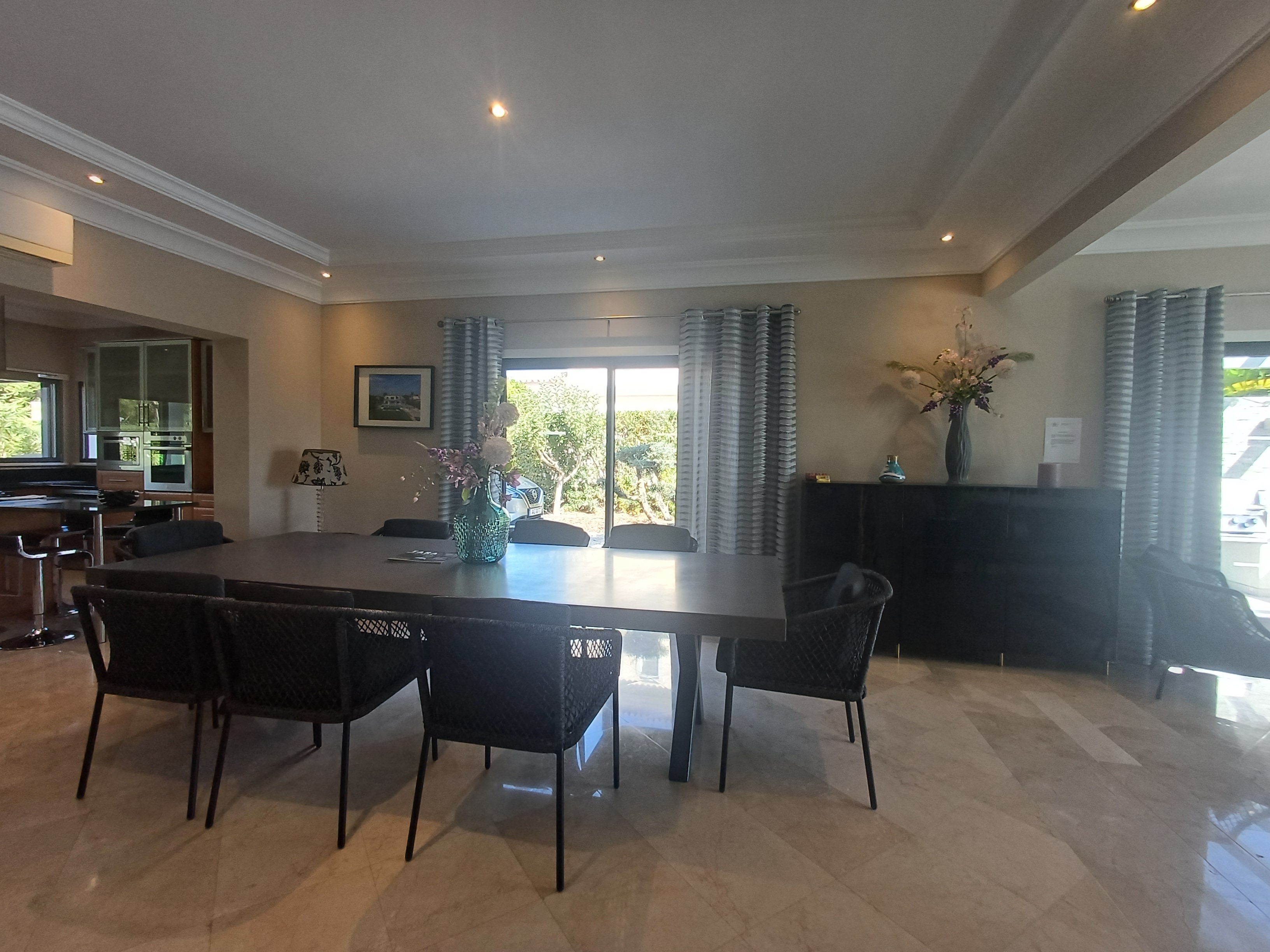 Bright and spacious open plan lounge, dining area and modern kitchen. Large patio doors run alongside the living areas giving easy access to the poolside and allowing plenty of natural light to pour inside. The living room has two large comfortable sofas, split unit air conditioning, a wall mounted flat screen Smart TV with a Samsung sound bar, and which shows a wide range of cable channels including the English language channels BBC, ITV, BT Sports and Sky Sports (please bring your own log-in credentials to enjoy Netflix, Amazon Prime etc). There is a second seating space where you can relax and read a book. Adjacent is the dining area with a large table and seating for eight people. There are more chairs available if necessary.