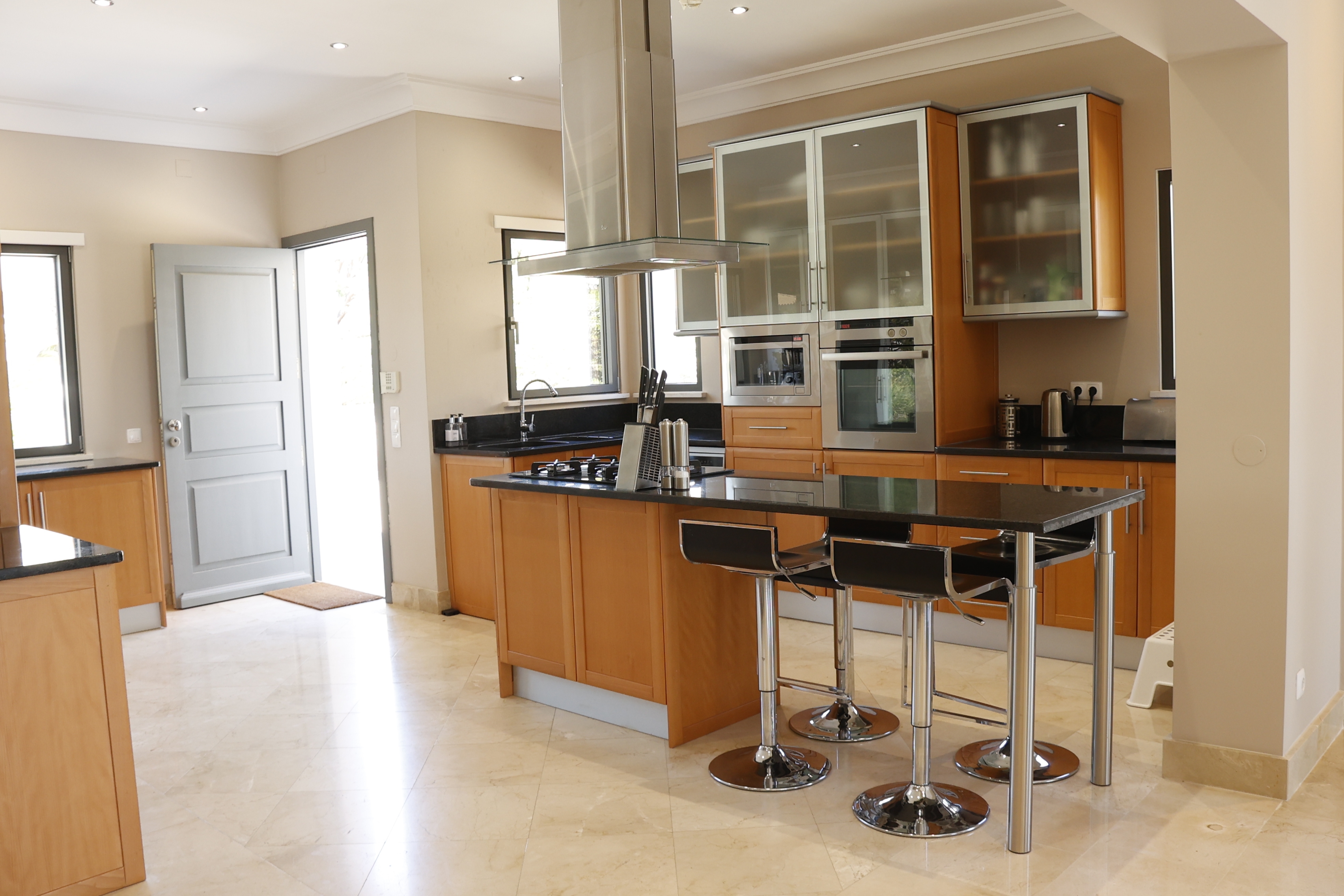 The air conditioned kitchen features a breakfast bar with four stools and is well equipped with appliances including a five-ring gas hob, extractor, American style fridge freezer, integrated electric oven, microwave, toaster, kettle, blender, 2 coffee machines and a dishwasher. There is also a guest cloakroom on this level.