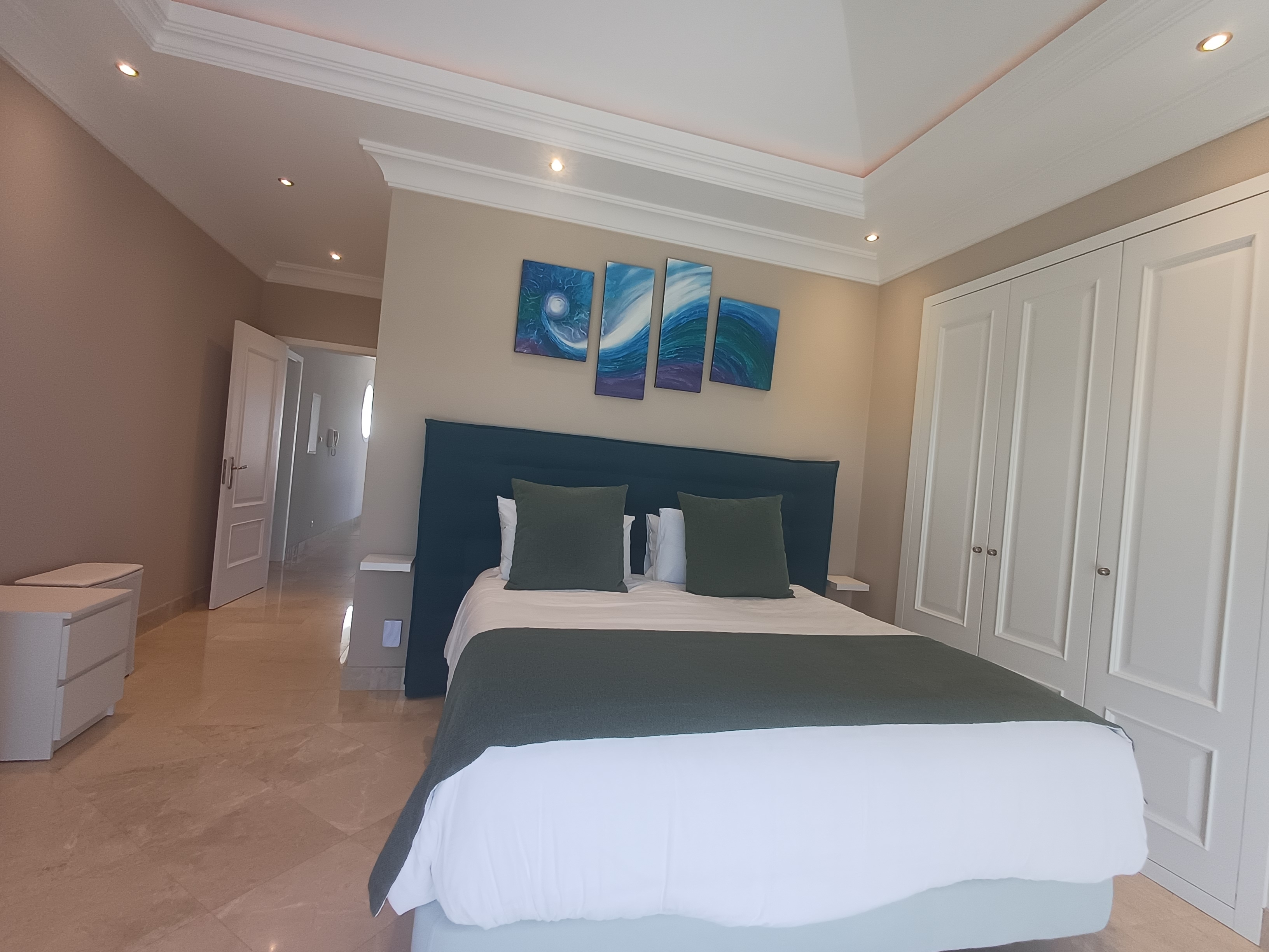 Stairs lead up to bedrooms three, four & five. Bedroom three is a double room with fitted wardrobes, split unit air conditioning and an ensuite full bathroom with a corner bath tub, walk-in shower, double vanities and a heated towel rail. Bedroom four is a double room with fitted wardrobes, a safe and an ensuite shower room with double vanities and a heated towel rail. Patio doors open onto a private balcony overlooking the golf course and furnished with two chairs. Bedroom five is a double room with fitted wardrobes, split unit air conditioning and a ensuite full bathroom with a corner bath tub, walk-in shower, double vanities and a heated towel rail.